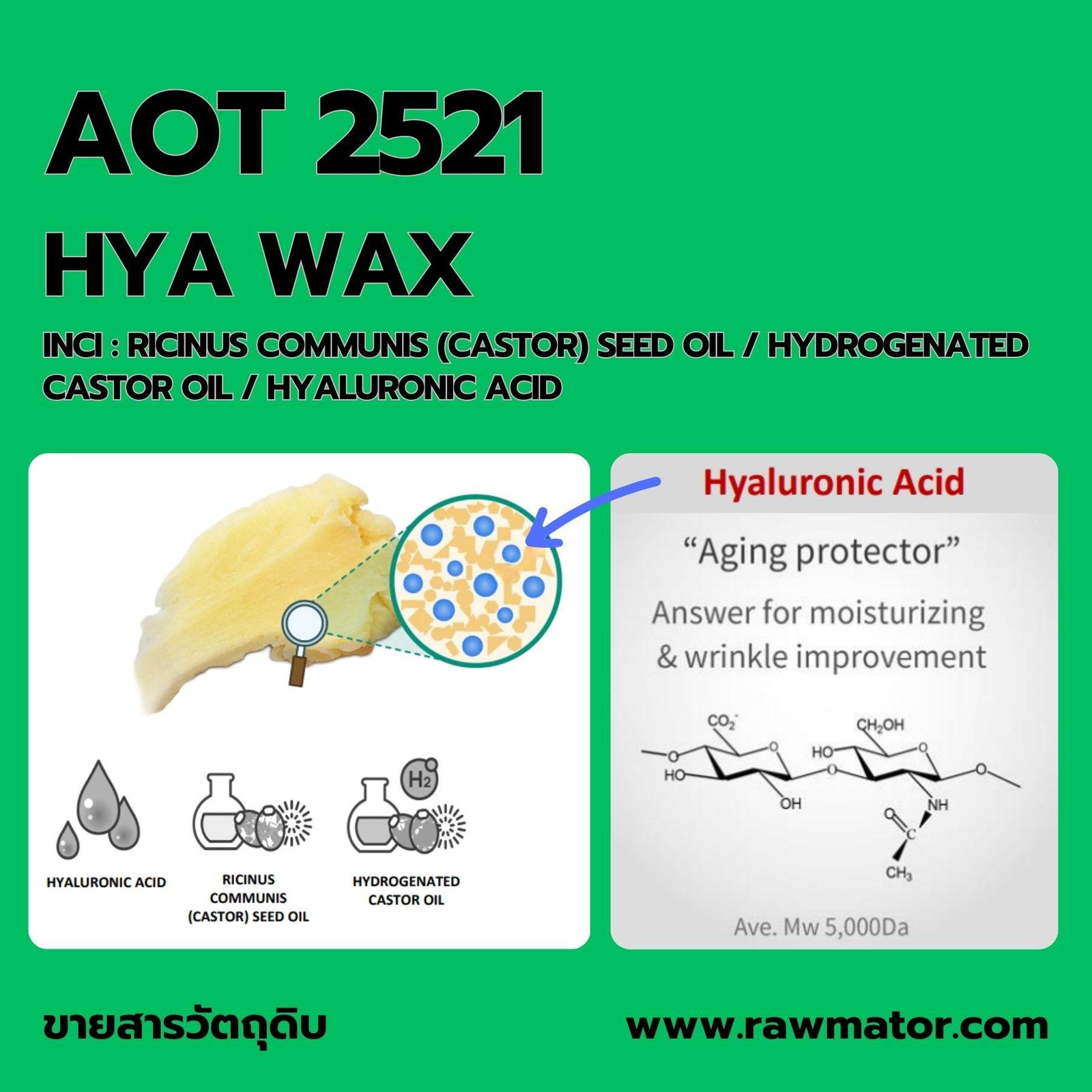 Description (รายละเอียด) : HyalWax คือกรดไฮยาลูโรนิกโมเลกุลต่ำ (5Kda) ที่กระจายตัวอย่างเสถียรในน้ำมันสองชนิด ได้แก่ น้ำมันละหุ่งไฮโดรจีเนตและน้ำมันเมล็ดละหุ่งริซินัส คอมมูนิส โมเลกุลของกรดไฮยาลูโรนิกจะซึมซาบเข้าสู่ผิวเพื่อให้ความชุ่มชื้นอย่างเหมาะสม และน้ำมันจะกักเก็บความชุ่มชื้นภายนอกผิวไม่ให้ระเหยออกไป